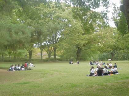 太陽の塔をながめながら、広い芝生でお弁当を食べました。