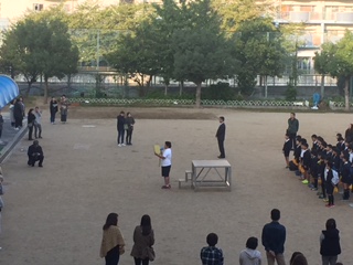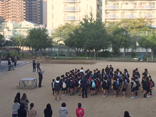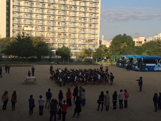 朝早くからお見送りのためにお集まりいただいた、たくさんの保護者の皆さまと教職員に見守られる中、6年生たちと教職員を乗せた3台の青いバスが、今、放出小学校を出発しました。