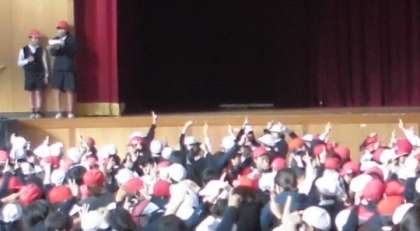 今回の集会は、学校クイズでした。班で相談して、正解と思う番号を指で表します。