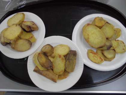 ホットプレートに切ったおいもを置いて、蒸し焼きにしました。できあがるまで、少し時間がありましたが、静かに待てました。おいものあまそうないいにおいがぷーん。こんがり焼けました。