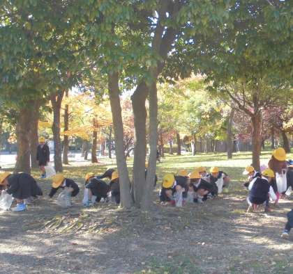 「秋見つけ」ということでしたが、冷たい北風が吹き、冬のような寒さでした。…が、子どもたちは元気いっぱい!!ビニル袋を片手にたくさんの落ち葉やどんぐり、木の実を拾っていました。紅葉もしっかりしていて、落ち葉も色とりどりでした。