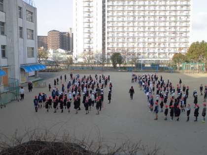 今日は、運動場で集会がありました。今週は1組、来週は2組、再来週は3組が行います。今回は、なわとび週間に合わせて、長縄の八の字とびに班のみんなでチャレンジします。集会委員会の児童が見本を見せ、高学年が縄を回したり、低学年児童に教えてあげたりしました。