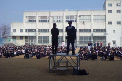 児童は、不審者侵入の緊急放送のあと犯人逮捕まで、教室の隅で固まって静かに息をひそめました。その後、運動場へ集合し、校長先生や城東警察署の方の話を聞きました。