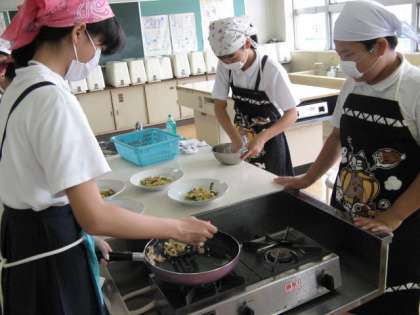 野菜を洗って、切って、炒めて、ハムや卵を入れて、盛り付けてと・・なかなか手さばきも素早く、班で協力しながら、楽しそうに活動していました。