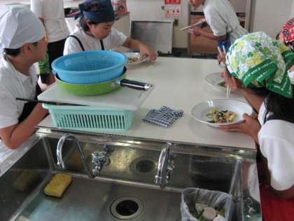 先日、6年生の各組が4日間に分けて、家庭科室で野菜炒めの調理実習を行いました。どのクラスの子も、職員室まで自分たちの作った野菜炒めのおすそ分けを持って来てくれました。とってもおいしくて、感激しました。味付けも上手にやっていました。