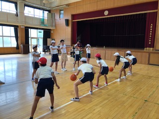ボールの扱い方からドリブル、パスまでいろんな練習をして、みんな、バスケットボールに夢中でした。