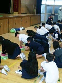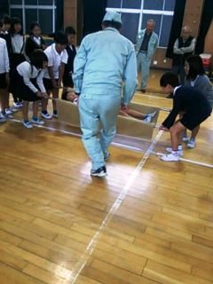 体験活動では、高学年は《心肺蘇生(救命訓練)》と、毛布と物干しポールを利用して《担架》をつくり、人を移動させる訓練を実施しました。