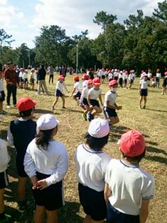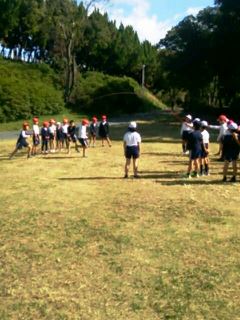 緑地公園内は、まだ台風21号の影響により多数の倒木や折れ枝があるため、利用可能なエリアで楽しみました。まずは、ミニ運動会。この日に向けて各学級で練習した大縄跳びで回数を競いました。