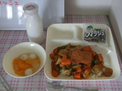 ・入学祝い献立では、カツカレーライス、フルーツ白玉。