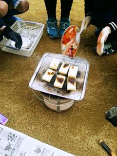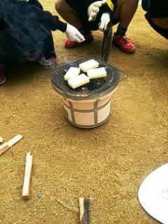 そのあと、七輪の火をつかって、おもちを焼きました。炭火の勢いはとっても強いので、すぐに焼くことができました。うまく焼けたおもちを、みんな笑顔で「おいしい♪」といただきました。