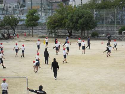 5.6年生の出前授業で、セレッソ大阪の選手が来てくれました。ゲームのような準備運動から始まり、みんな楽しんで取り組んでいました。いろんな方向に歩く友だちを後ろからドリブルしながら追いかけていくのですが、ボールばかり見ていると友だちを見失ってしまいます。それもだんだんとうまくなりました。先生チームとの試合も楽しんでいました。たくさん体を動かすことができました。