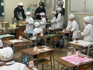 新年度がスタートしました。7日の入学式、8日に始業式があり、今日から給食も始まりました。6年生が1年生の給食を助けます。初めての給食はおいしかったかな?