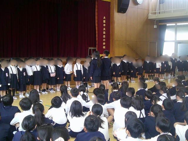 1年生と2~6年生の対面式を行いました。朝会で在校生が集まっている講堂に、かわいい1年生が入ってくると、みんな拍手でお迎えしていました。校長先生や6年生児童代表の言葉を聞いたあと、1年生がみんなで「よろしくおねがいします!」と大きな声で言いました。先月まで1年生だった2年生も、頼もしい顔になっていました。困ったことがあったら、2~6年生のお兄さんお姉さんが優しく教えてくれることでしょう。