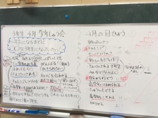 子どもたちは4年生になるまでにどんな3年生になっていたいか、1年間の目標について話し合いました。