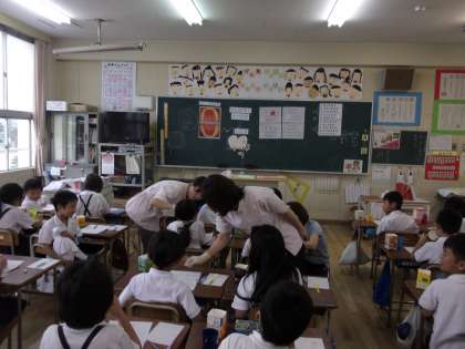 歯科衛生士さんに来てもらい、みがきのこしはないか、歯を染めて確かめています。歯みがきの仕方も、教えてもらいました。
