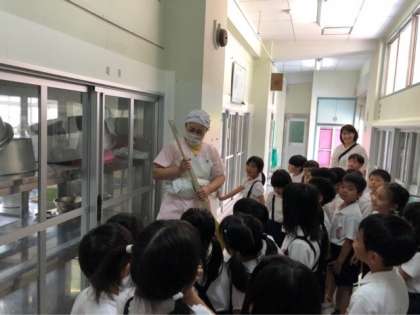 給食室では、鍋や食材を混ぜる道具が大きいことに驚いていました。