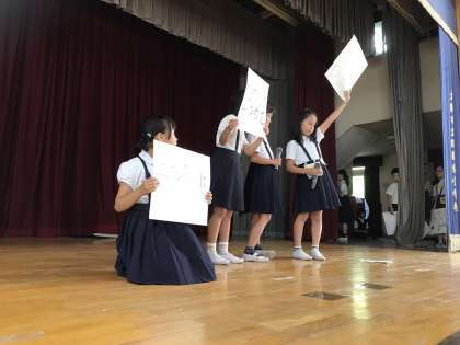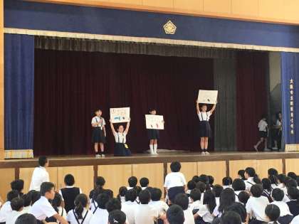 普段、委員会などで5.6年生が使っているあこがれの舞台の上で、全校児童に話している3年生の姿は、緊張していながらもとてもたくましいものでした。
