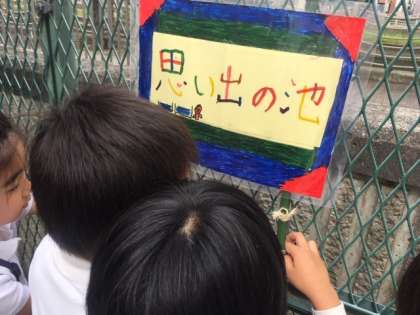 また、池の名前が決まったことを伝えるためにポスターや新聞に書いて、各クラスや職員に伝えに行ったり、パペットを使って劇にして伝えたりする児童もいました。