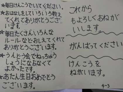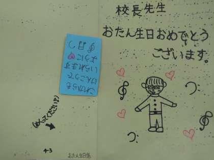 学校長に4年3組の誕生日係から誕生日カードが届きました。