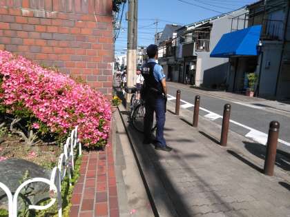 今日は、校門に警察官の方が子どもたちの登校を見守ってくださりました。