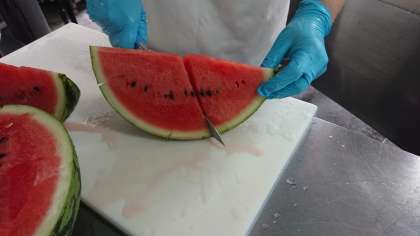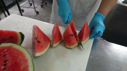 スイカの切り方は、みんなに甘い部分が行き渡るように給食調理員さんが工夫してカットされていました。