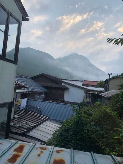 只今、5時30分。山には霧がかかっていますが、空は晴れています。