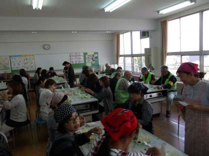 10月16日(木) 保護者と見守り隊の方で、給食試食会を行いました。給食を作る様子を見学して、子ども達と同じメニューの給食を食べていただきました