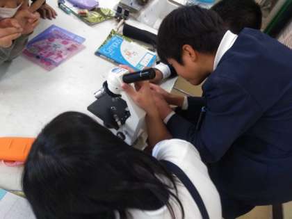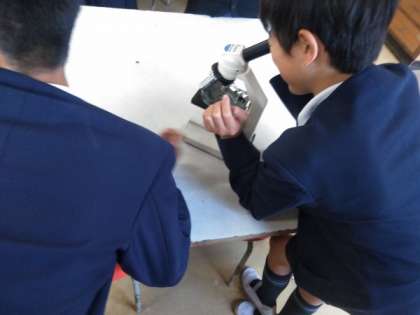 顕微鏡を使って火山灰を観察していました。