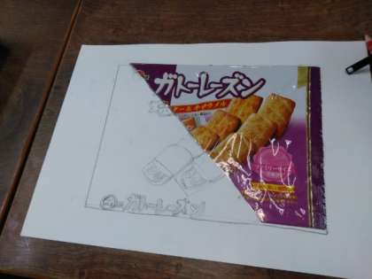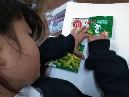 お菓子の袋を上手に切り、残りを自分の力でかいていました。