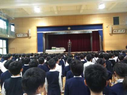 今日は、お天気がよくなかったので、講堂で児童朝会を行いました。