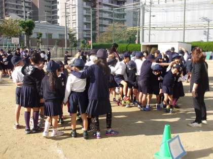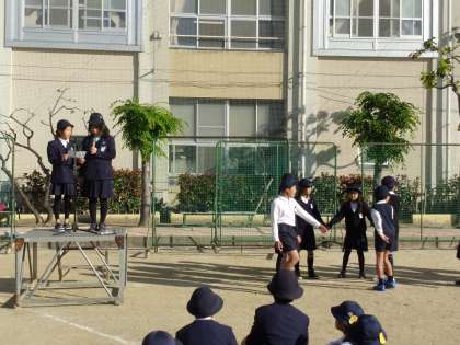 毎週、木曜日に集会委員会を中心に「児童集会」を行っています。全員でたてわりのグループを作り、いろいろなゲームや委員会の紹介などをしています。今日はいい天気の中、運動場で、グループの全員が手をつないで、知恵の輪を作って、その後ほどくというゲームをしました。手を離さずにできたかな?