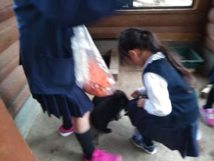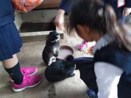 1年生の児童がウサギにえさやりをしていました。ウサギは、お腹が減っていたようで、とても喜んでいました。