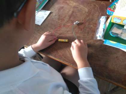 理科の回路の学習をしていました。実際に電池を使って電球がつくか実験をしていました。