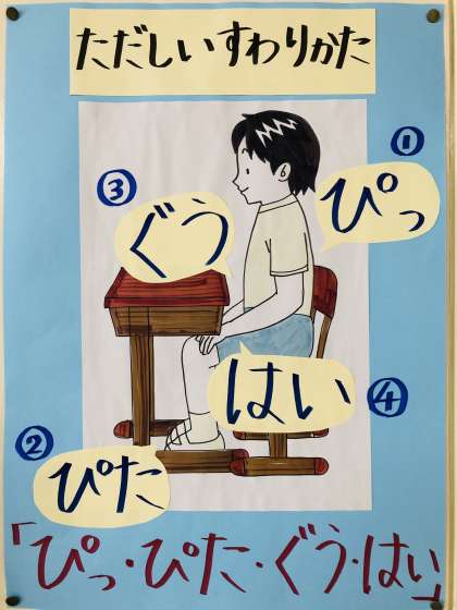 姿勢が悪いと、筋肉の発達のバランスが悪くなったり、集中が続かなかったりするということを聞きます。ご家庭でも、保護者の方が先生役で声かけをしてみてください。元気よく声をかけると、子どもの気持ちが乗って楽しんでするようになります。正しい姿勢ができたら、たくさん褒めてあげてください☆
