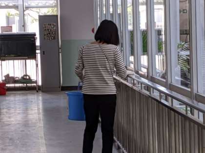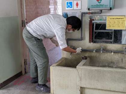 学級担任は、教室の机やドアノブやスイッチなどを消毒しています。