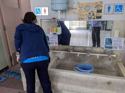 前半グループの下校から後半グループの登校までの間、消毒作業を行いました。