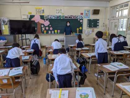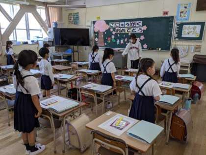挨拶をし、学校ですごしかたのお話を聞いていました。