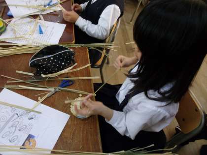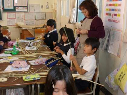 11月27日(木)4年生は、かさこ地蔵で使う「すげがさ」のすげ細工を保存されている「深江菅細工保存会」の方にきていただき、すげでオリジナルのコースターを作りました。家で、使ってね。