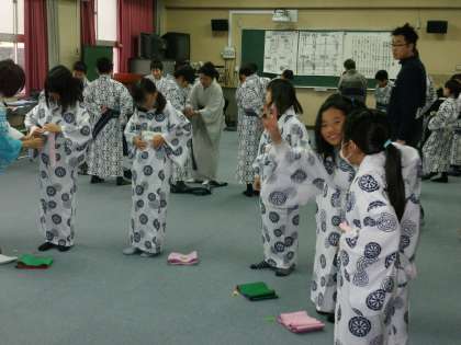 5年生は2度目の着付教室を行いました。もう、すぐに浴衣は着れたかな。