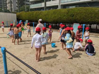 水着に着替え、ポリ容器やペットボトルなど、家庭から持ち寄った道具で水遊びを行いました。