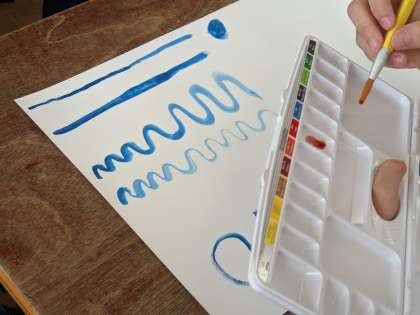 絵の具の筆をつかって、線をたくさん引いています。絵の具の量、水の量によって色が変化することを描きながら実感しているようです。