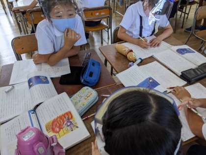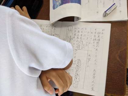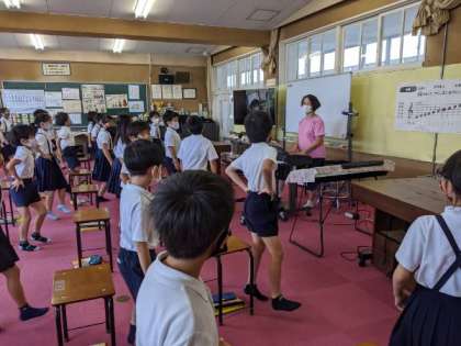 指導者のオルガンの音楽に合わせて、体を動かしていました。