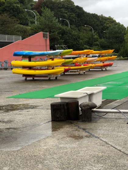 雨の中、カッパを着てカヌーの始まりです。