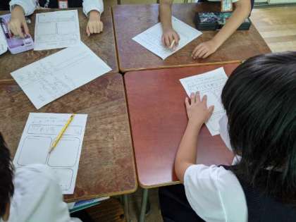 グループで協力して、1年生を招待するおもちゃランドづくりを進めていました。