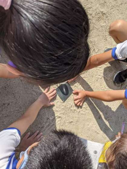 ルーペで太陽の光をあつめると、色画用紙がこげていました。