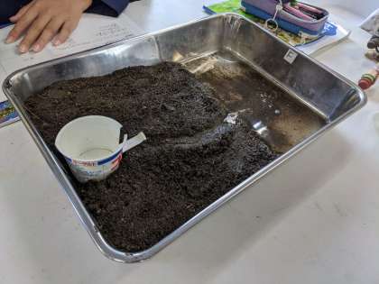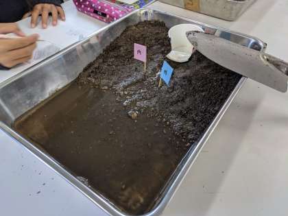 水の量が増えると流れる水のはたらきが変化するのか、実験をしていました。