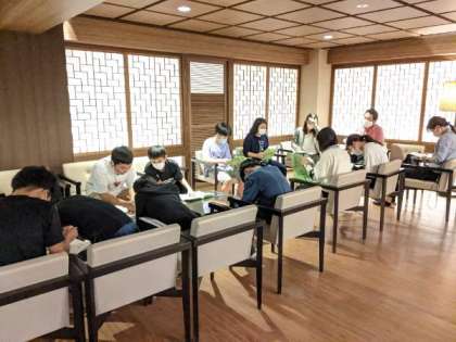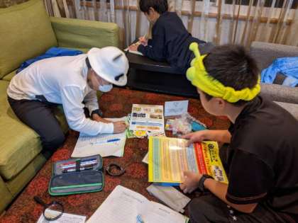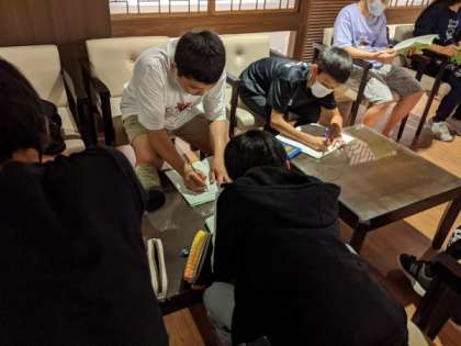 今日1日の振り返りをリーダーたちで進め、その後、部屋に戻ってグループでノートに記入しました。