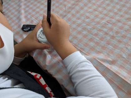 ジャムを煮詰めている間、自分のびんに模様をかいています。