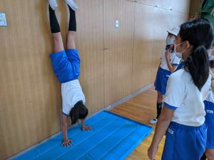 倒立や、前転・後転などに取り組んでいました。