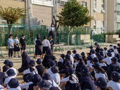 今日は、外でたてわり班ごとに集まって、集会を行いました。
